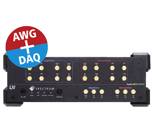 ? ? ? ? HybridNETBOX系列內部由一個數據采集卡和一個AWG組成,可以一起運行,也可以獨立運行。這就允許同步數據生成和數據采集用于響應測試、自動測試設備應用、MIMO應用或閉環應用等。獨立使用時,數字化儀可在現場采集測試數據,AWG可在實驗室回放測試數據。hybridNETBOX提供14/16位分辨率,ADC的采樣率為180MS/s和400MS/s,AWG的回放速率為625MS/s和1.25GS/s。hybridNETBOX可以安裝在局域網上,并且可以從主機PC遠程控制。