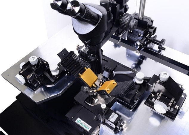 - 探針臺右上方有轉(zhuǎn)輪搖桿,搖動時可使臺面線性上下升降,升降范圍25mm,精度1μm。在探針臺加裝探針卡點測wafer時方便對die的復(fù)位