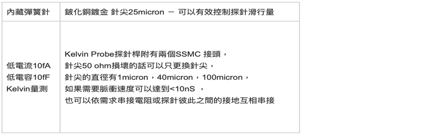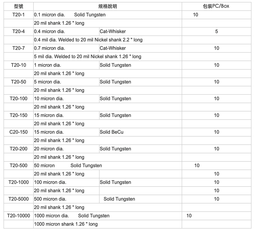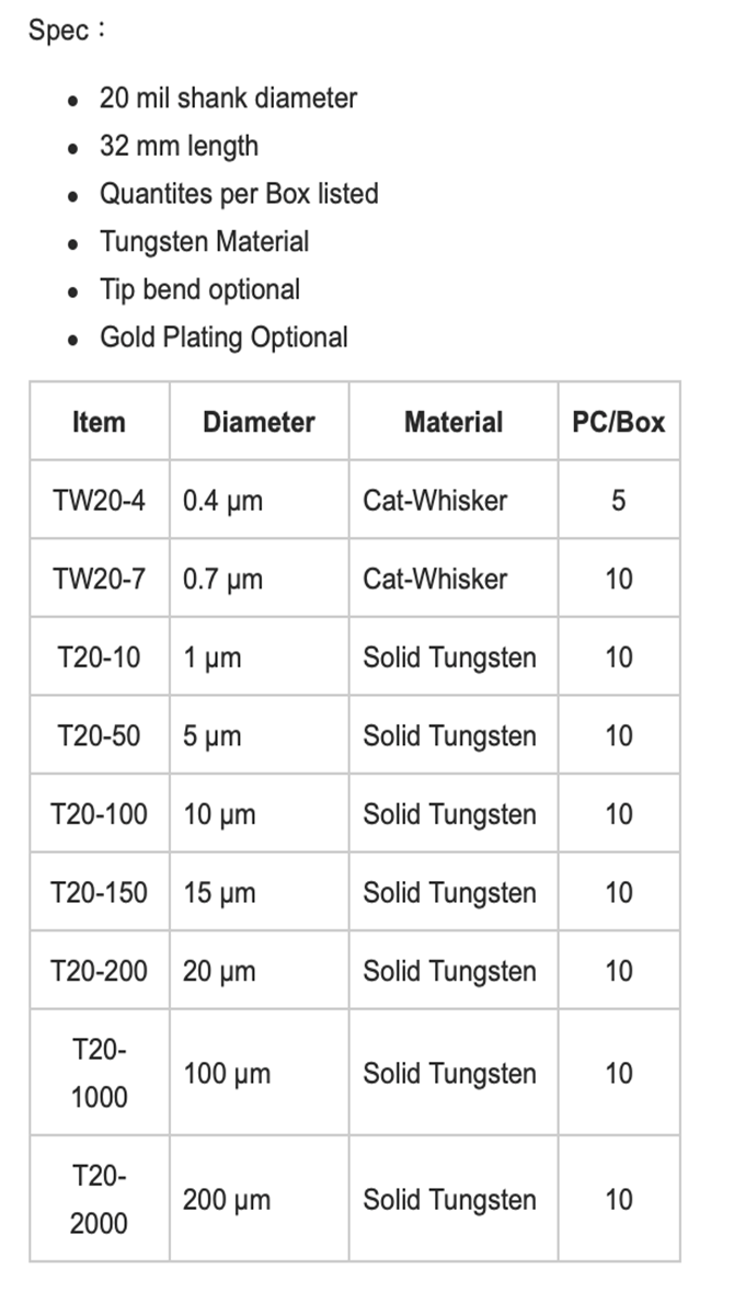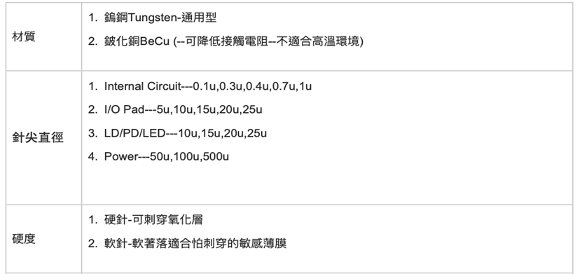 鎢鋼 針尖最小100 nm 0.1 micron 可選擇硬針,軟針,彎針及電鍍金 l 鈹化銅 針尖最小10 micron 可要選擇硬針,彎針及電鍍金